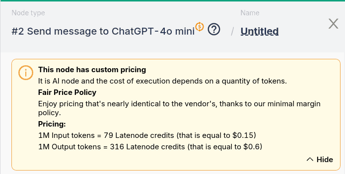 Note: ChatGPT 4o Mini is the plug-and-play integration node, which means it has custom credit consumption but you also don’t have to handle API tokens or any credentials to use it.