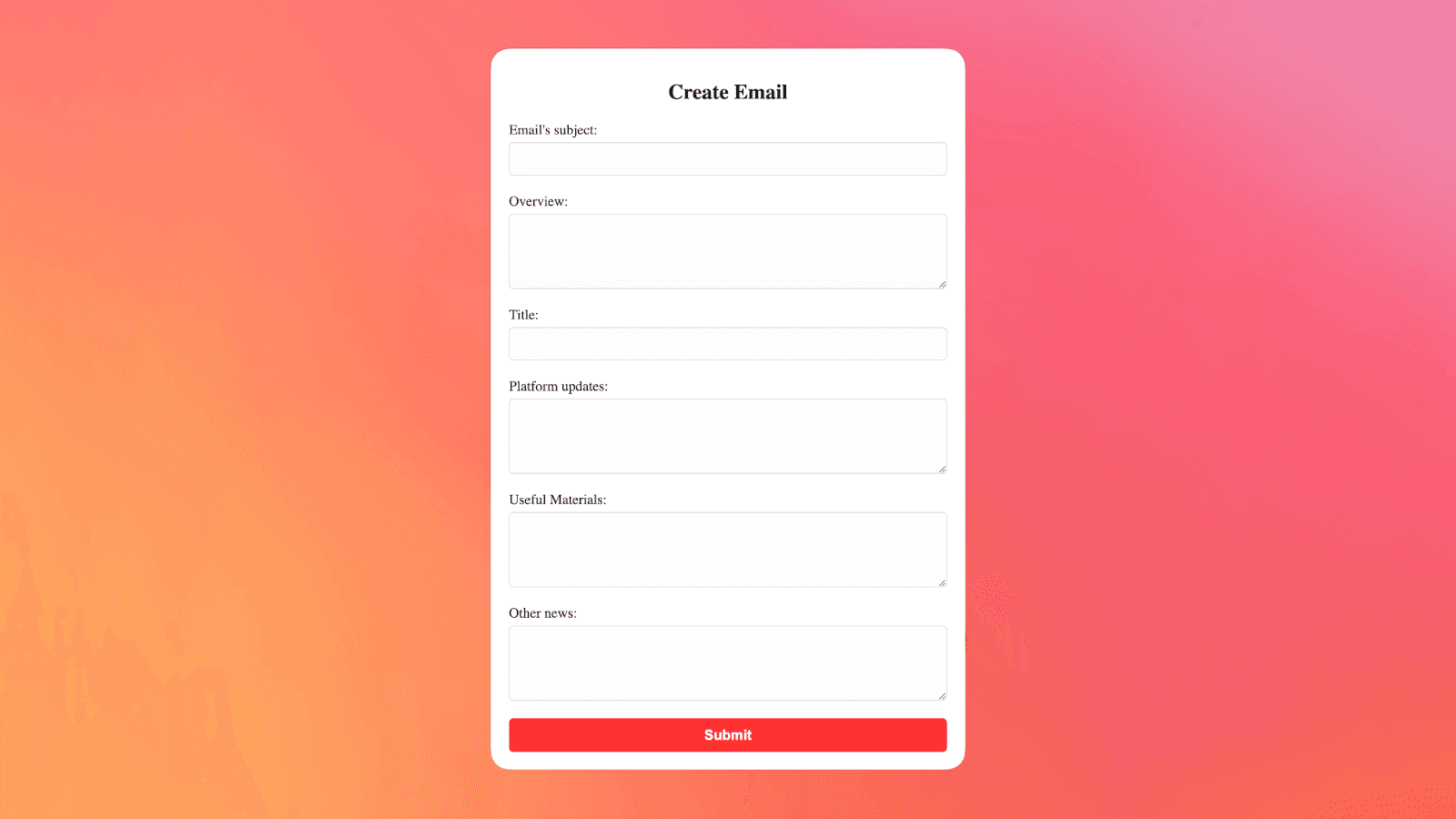 Hola! Adjunta mi código con un script para generar HTML para un formulario titulado "crear correo electrónico". Debería tener estos campos de entrada: "asunto del correo electrónico", "descripción general", "encabezado", "actualizaciones de la plataforma", "recursos útiles", "otras noticias". Coloca un botón "enviar" en la parte inferior. Embellece el HTML con un diseño agradable y un formato adecuado. Devuelve el resultado como un objeto JSON etiquetado como "html"