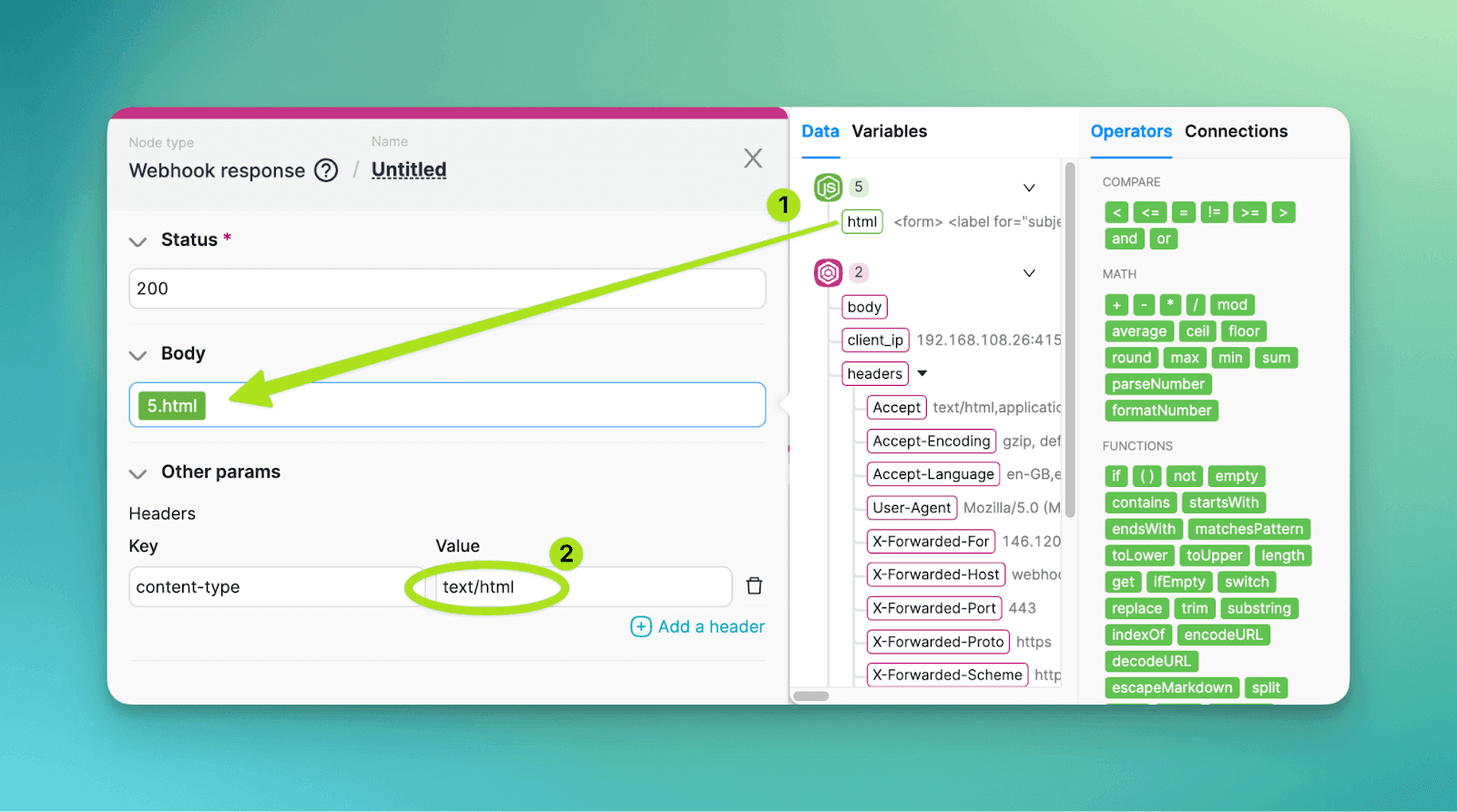 El módulo JavaScript devolverá el objeto JSON "html" adecuado para las respuestas del webhook. Además de esto, cambie el parámetro de tipo de contenido a texto/html para mostrar el formulario correctamente a través de nuestro webhook de entrada.