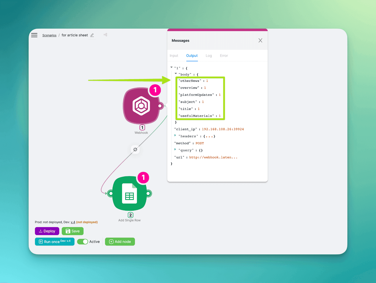 Todo lo que queda es garantizar que los datos recopilados a través del formulario se transmitan al webhook de otro escenario para su posterior procesamiento. Por supuesto, no codificaremos esto manualmente.