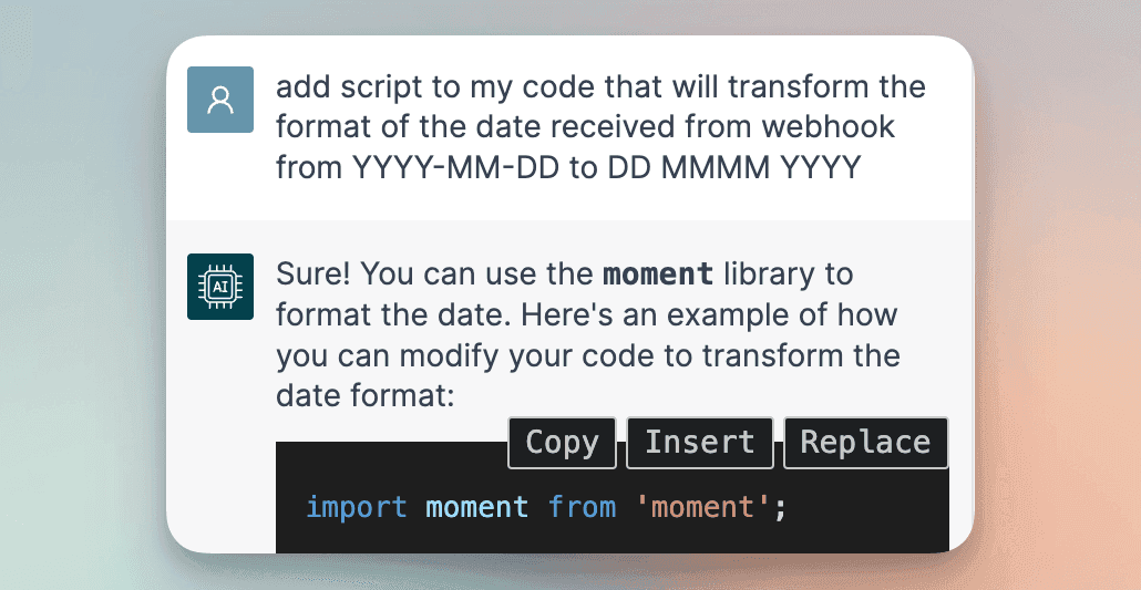 En este artículo, descubriremos las posibilidades ilimitadas de nuestro nodo JavaScript combinado con un Asistente de IA que le permite crear integraciones con cualquier servicio web o transformar datos de manera flexible, todo en cuestión de minutos. Con dos opciones sencillas para usar nuestro módulo JavaScript con tecnología de IA, puede acceder al nodo de IA para una configuración rápida o sumergirse directamente en el nodo de JavaScript para obtener más control.