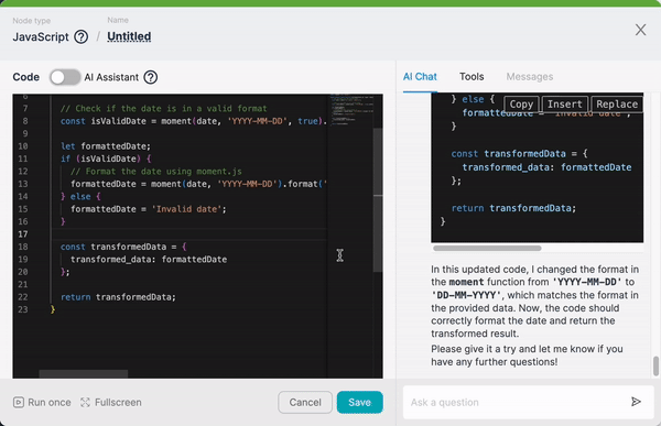 Nodo de JavaScript:Una vez que se sienta cómodo con AI Node, puede pasar a JavaScript Node para obtener un control más personalizado. Aquí, el Asistente de AI ayuda dentro del módulo JavaScript, guiando la creación de código, la resolución de problemas y los ajustes personalizados según sea necesario. Para recibir asistencia, puede interactuar a través de la ventana "AI Chat".