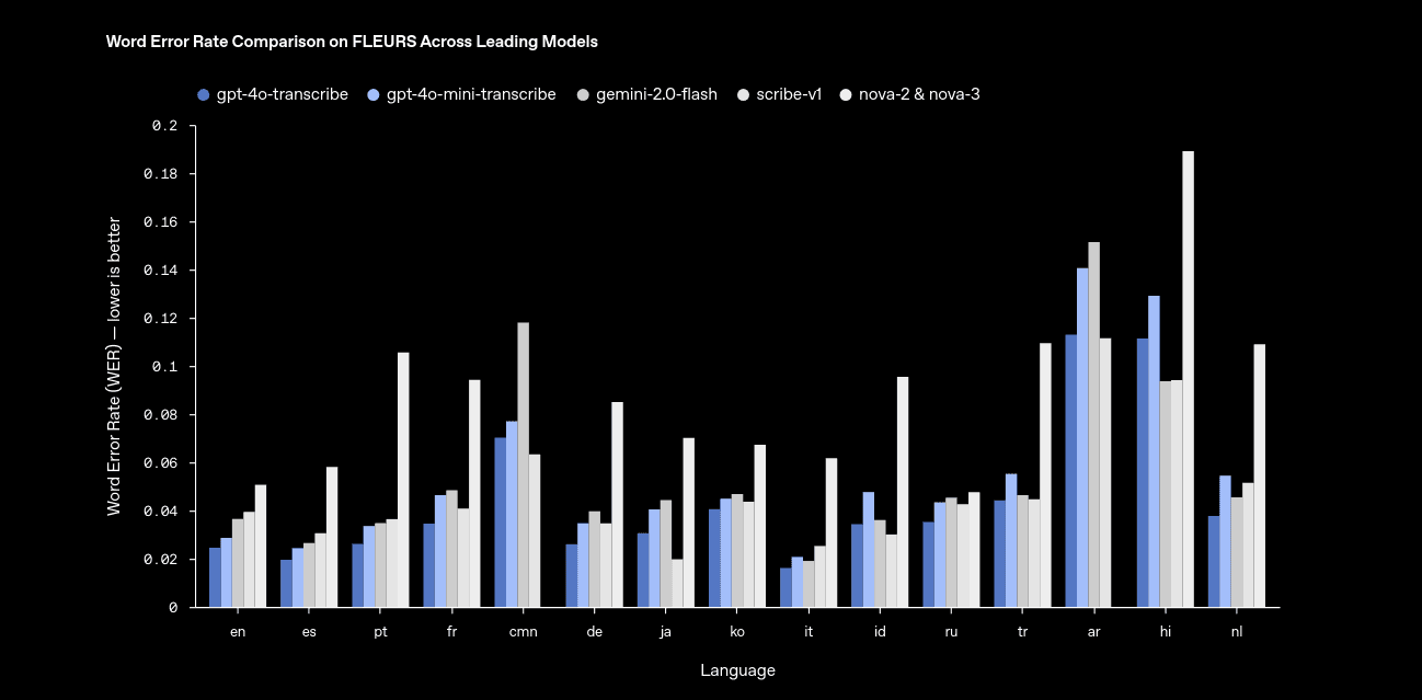 Y los puntos de referencia lo respaldan: estos modelos tienen una tasa de error de palabra (WER) más baja en varios idiomas y condiciones acústicas. Esto no se aplica solo a tu próxima aplicación de asistente personal; piensa en aplicaciones legales, médicas, centros de soporte o cualquier aplicación donde los errores de transcripción cuestionen dinero y confianza.