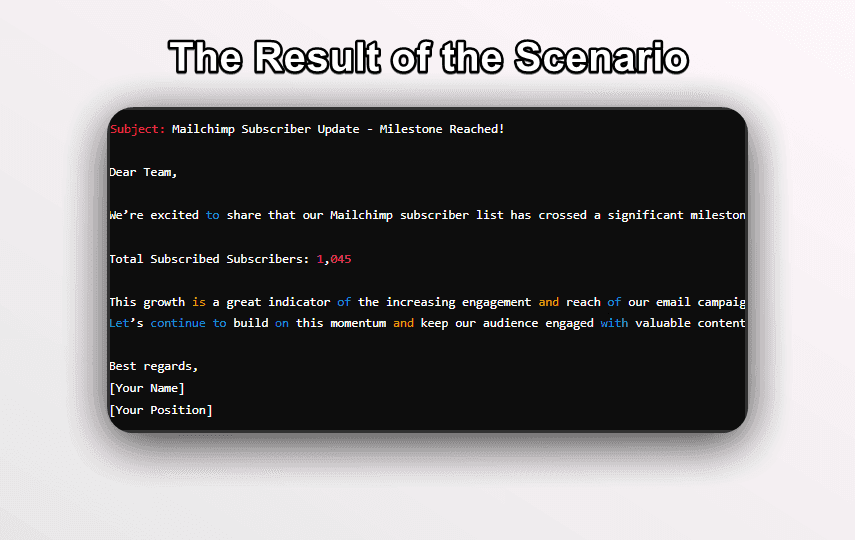 - Notificación:Envíe notificaciones basadas en los resultados del análisis. Por ejemplo, notifique a las partes interesadas sobre métricas clave de suscriptores o genere informes para los equipos de marketing.