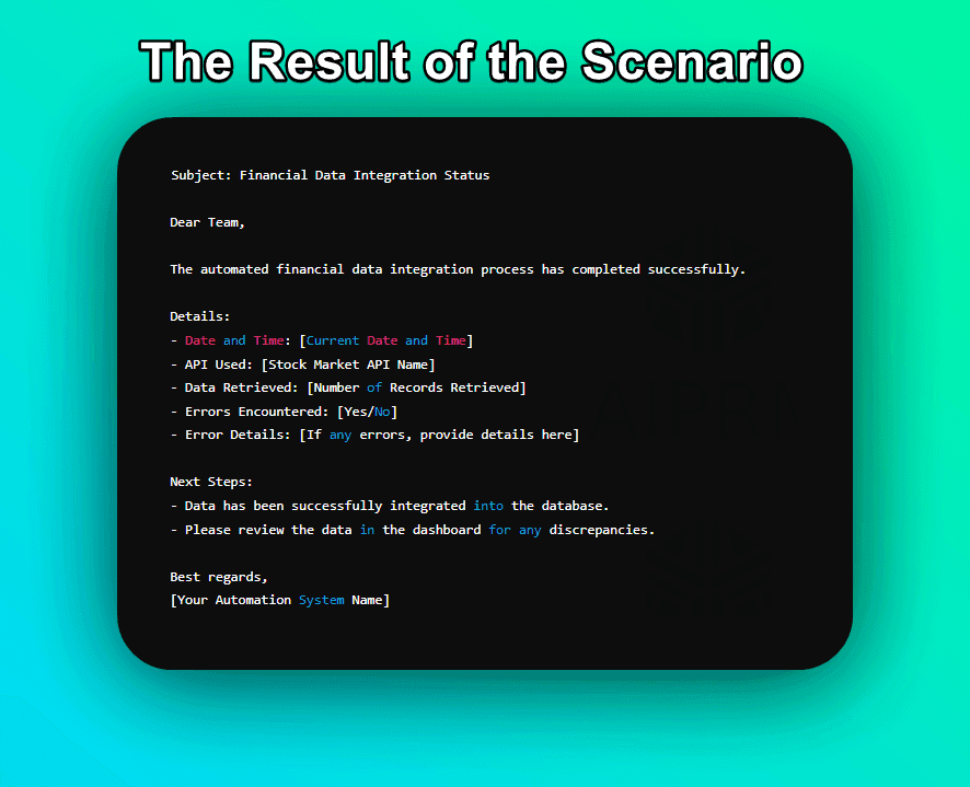 - Notification: Envoyez automatiquement une notification (par exemple, un e-mail ou un message Slack) à votre équipe résumant le processus de récupération des données, y compris les erreurs rencontrées ou l'état de l'intégration.