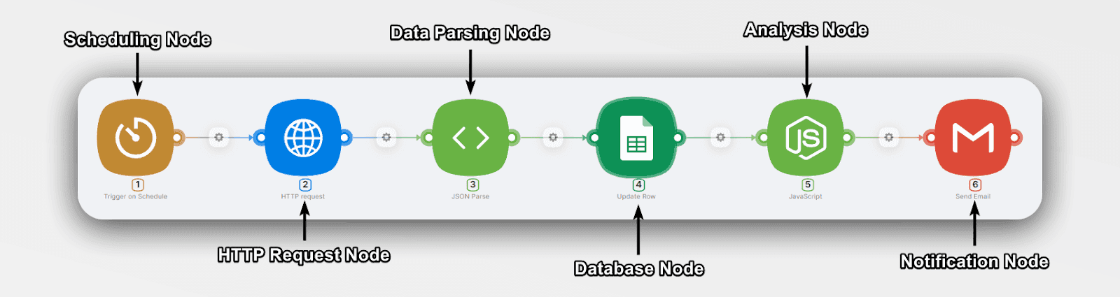 Cette image montrerait une représentation visuelle du flux de travail dans l'interface de Latenode, avec des nœuds connectés représentant chaque étape du processus, de la collecte des données à l'analyse et au stockage.