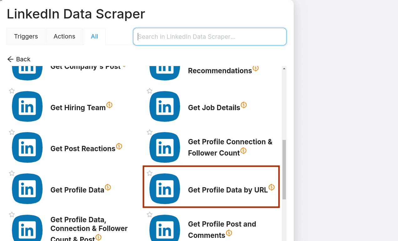 notable, tous les blocs Linkedin Data Scraper sont payantsVous devrez payer 11 crédits (0.02 $) par demande pour les utiliser.