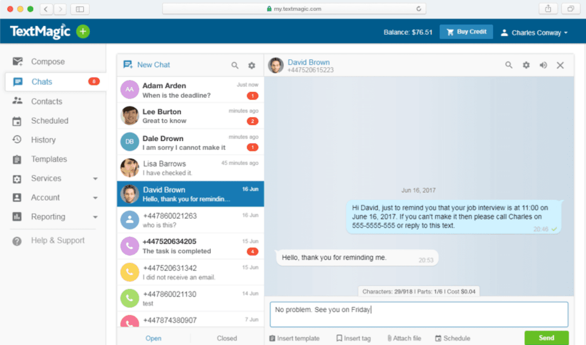 "TextMagic, par exemple, propose une assistance client 24h/7 et XNUMXj/XNUMX pour vos besoins de marketing par SMS et de messagerie commerciale par chat, e-mail ou appel téléphonique. Leur équipe commerciale dédiée veille à ce que tous les problèmes de messagerie ou de marketing par SMS soient résolus avant qu'ils ne deviennent des maux de tête majeurs.