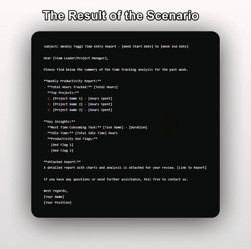- Notification : Envoyez des notifications par e-mail aux chefs d'équipe ou aux chefs de projet avec le rapport généré, mettant en évidence les informations clés et les problèmes de productivité identifiés lors de l'analyse.
