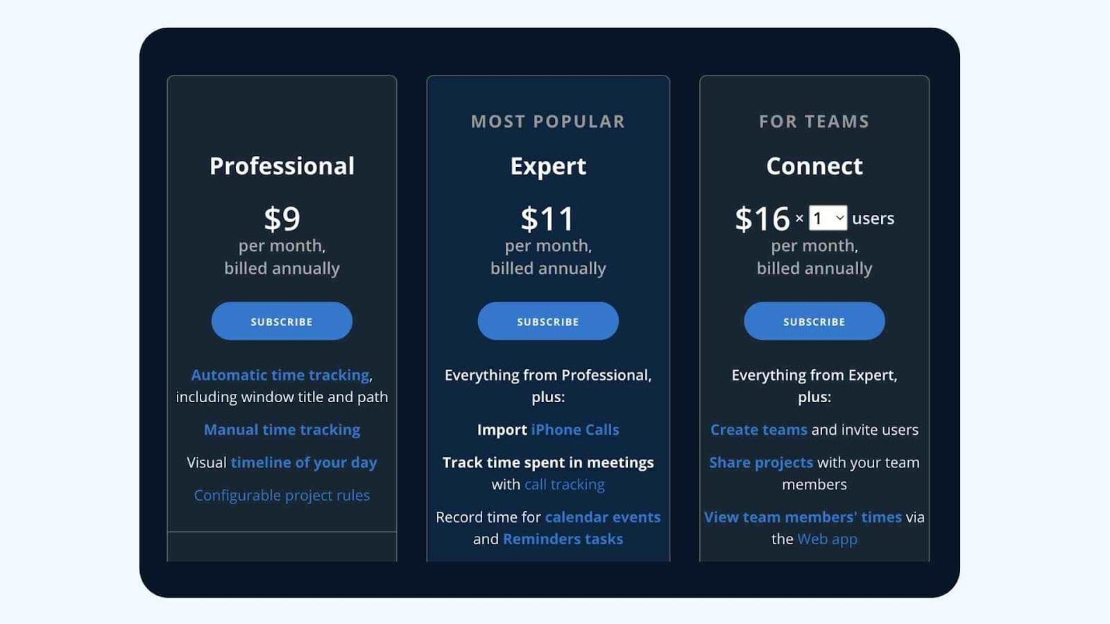 | Timing | Suivi automatique, axé sur la confidentialité | $ 9/mois | Professionnels individuels centrés sur Mac |