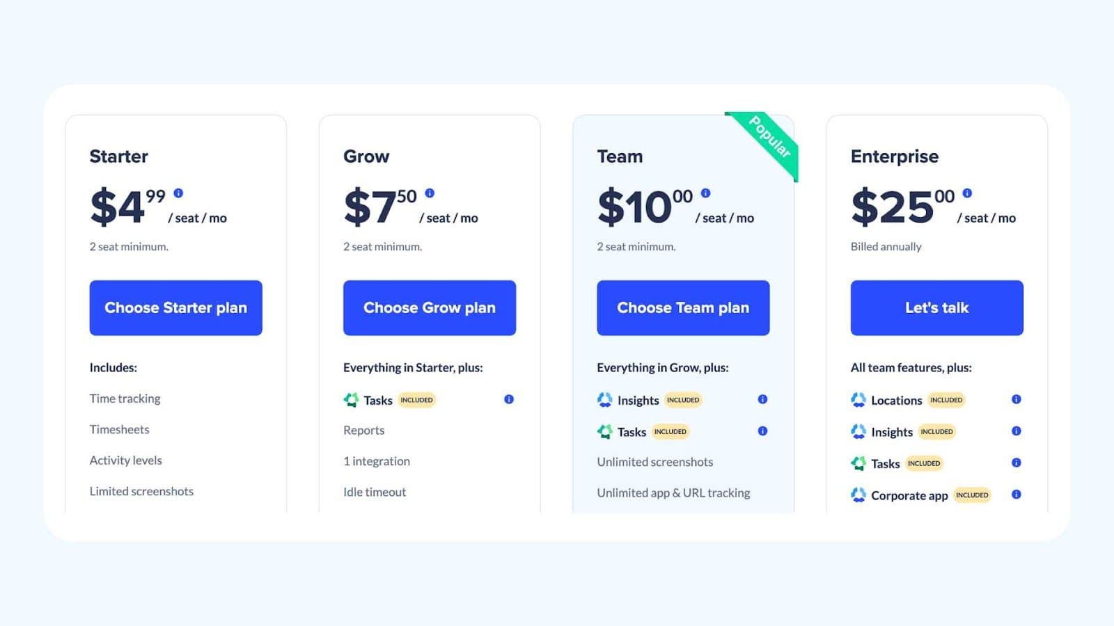 - Plan de démarrage: 9 $ par utilisateur et par mois (facturés annuellement) avec des fonctionnalités supplémentaires telles que des tarifs facturables et l'arrondi horaire