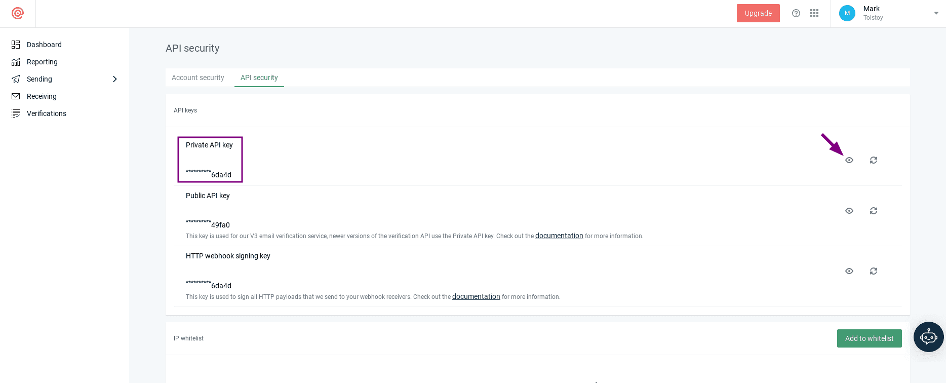 La clé API Mailgun est également dans le Paramétres dans le profil: