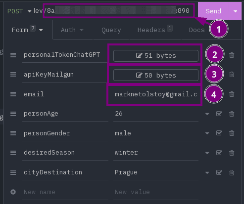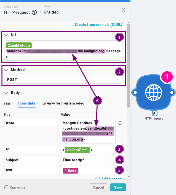 Dans l'URL, nous mettons d'abord le apiMailgun variable du premier nœud « JavaScript », puis /votre domaine dans Mailgun/, à la fin /message;
