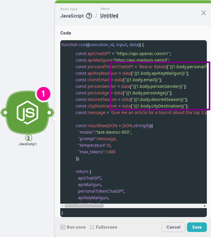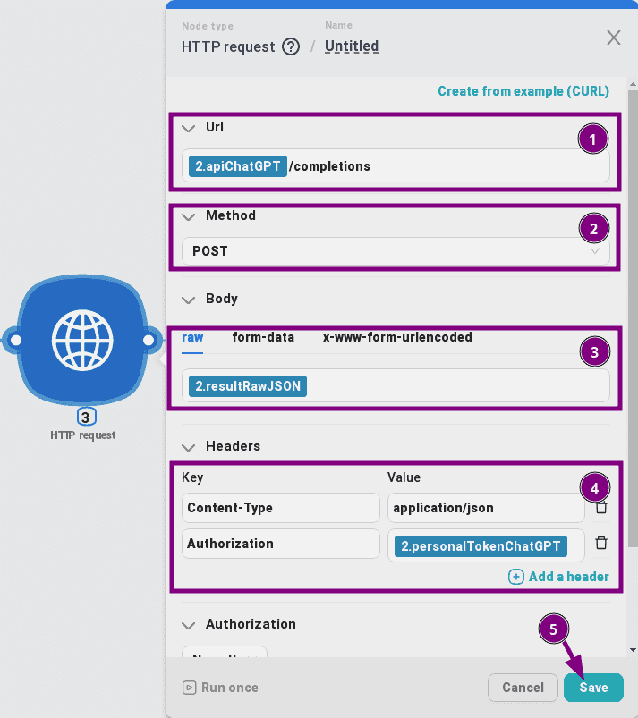 - Autorisation, dans la valeur, sélectionnez une variable du nœud « JavaScript » avec le nom : Jeton personnelChatGPT