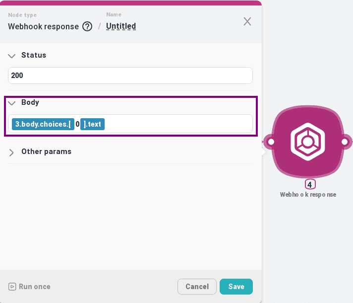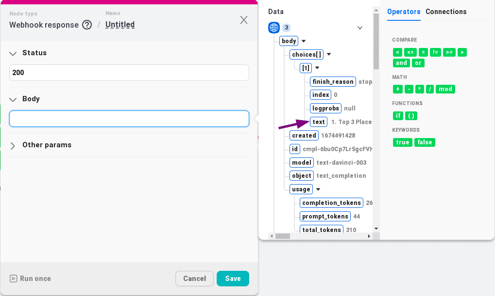 Ajoutez un nœud « Réponse Webhook » pour renvoyer le texte généré par ChatGPT dans la réponse : « + Ajouter un nœud » => « Http » => « Réponse Webhook » ;