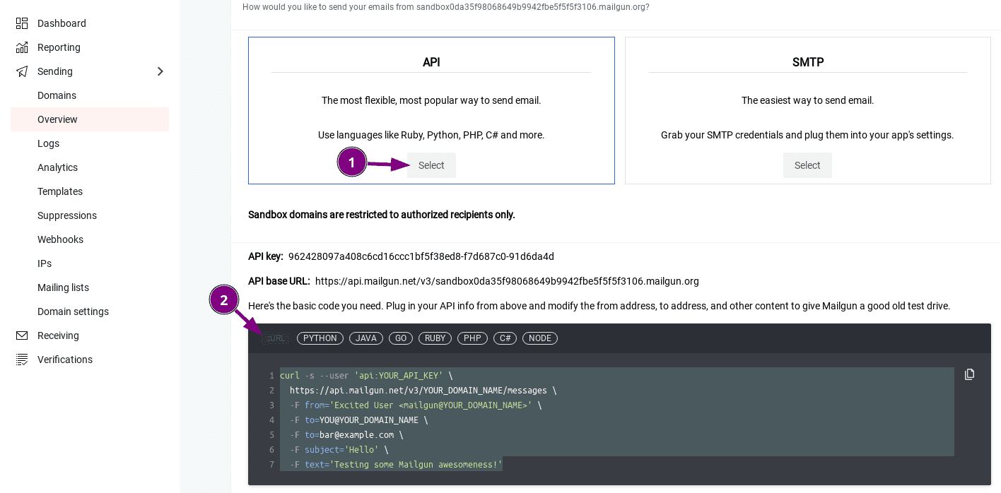 Ensuite, allons sur le site Mailgun dans la section : « Envoi » => « Aperçu » ;
