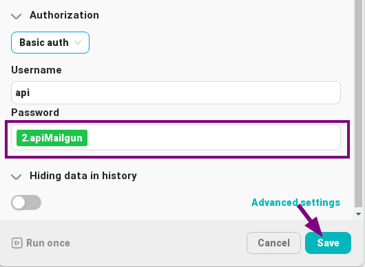 Ci-dessous, dans le bloc « Autorisation » à côté du champ « Mot de passe », insérez le apiKeyMailgun variable du premier nœud « JavaScript » ;
