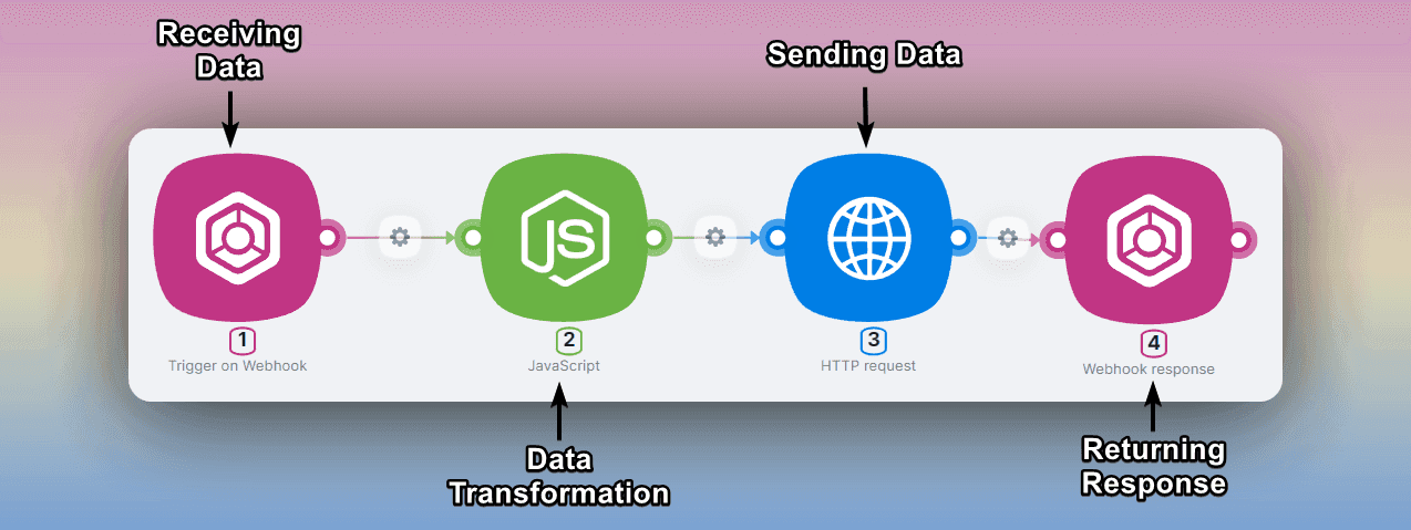 - Nó de resposta do webhook: Retorna uma resposta indicando o sucesso da execução do cenário.
