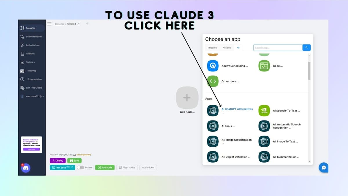 - Clique Adicionar nó e encontra IA Antrópico Claude 3 em “Al ChatGPT Alternativas"