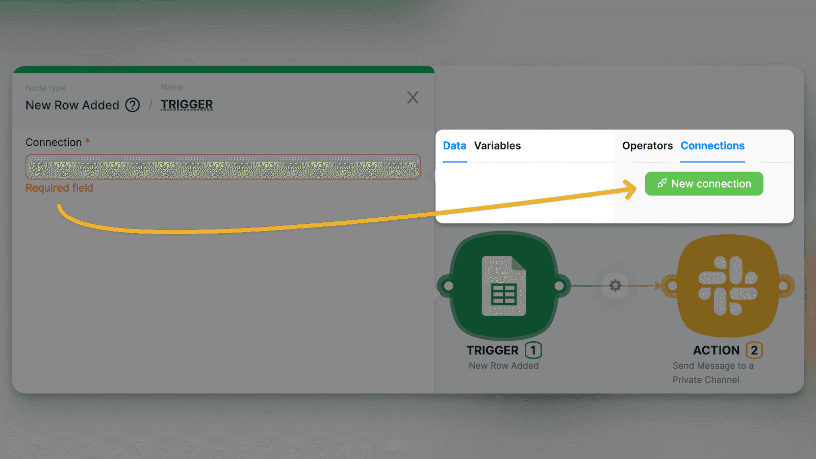 Um bom exemplo – o módulo Planilha Google mostrado na captura de tela acima. Isso significa que se algo acontecer em uma Planilha Google específica, seu cenário será executado automaticamente. Para usar gatilhos da nossa biblioteca sem código, basta conectar suas contas adicionando uma nova conexão. Depois que isso for feito, você poderá preencher todos os campos obrigatórios em apenas dois cliques.