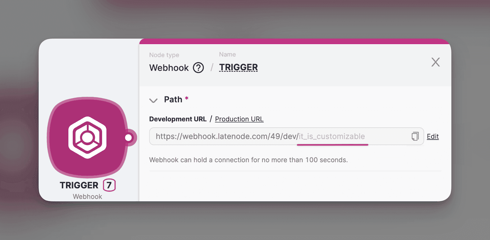Este módulo aciona o cenário toda vez que uma chamada externa é feita para uma URL de webhook. Pense nisso como se estivesse ligando para alguém e dizendo: "Luz verde! Comece a trabalhar imediatamente." Além disso, se você deseja retransmitir informações cruciais para seu cenário, isso é possível por meio da URL do webhook. Além disso, personalizar sua URL do webhook é simples; consulte a captura de tela abaixo para obter orientação.