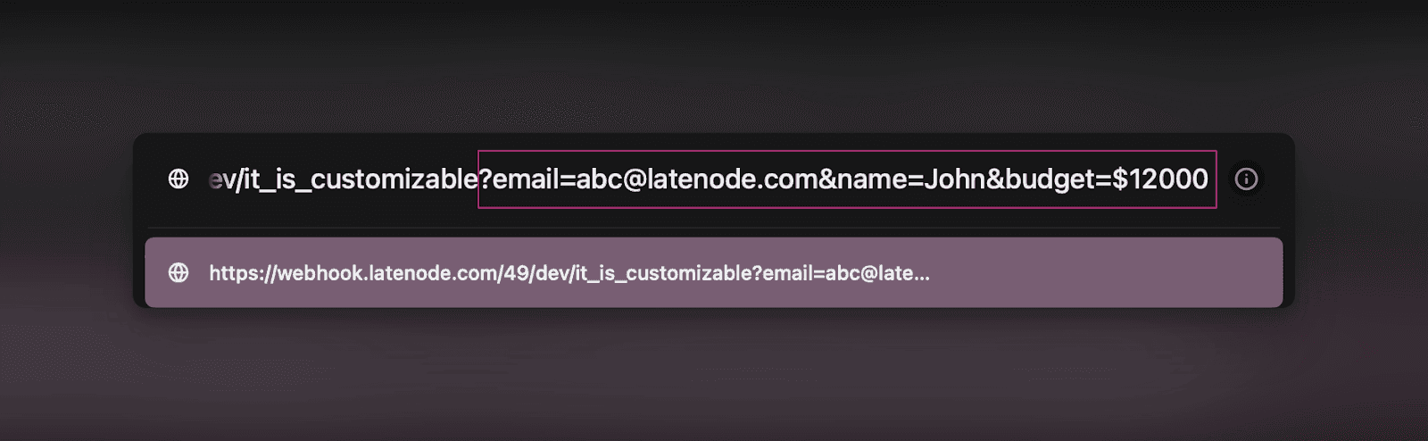 - Então, inserimos nossa URL do Webhook na linha de comando do navegador e adicionamos três chaves com seus parâmetros correspondentes que queremos enviar para o cenário: orçamento, e-mail e nome. Pressione enter.