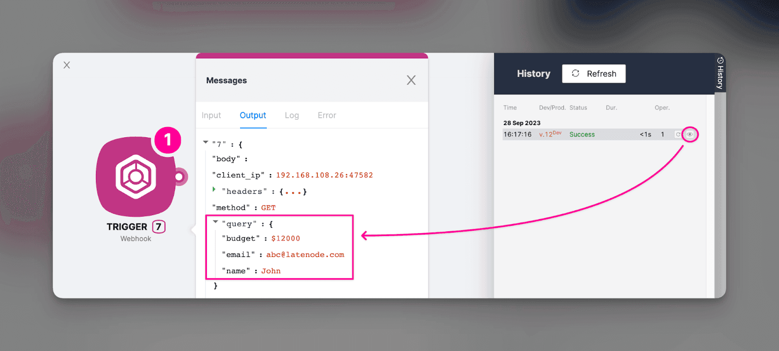 - Quando clicamos no ícone de olho na lista de lançamentos históricos, vemos um número circulado ao lado do módulo Webhook – sua saída histórica. Ao clicar, uma janela pop-up aparece exibindo o resultado da execução. E como você pode ver, todos os três parâmetros (orçamento, e-mail e nome) já estão lá!