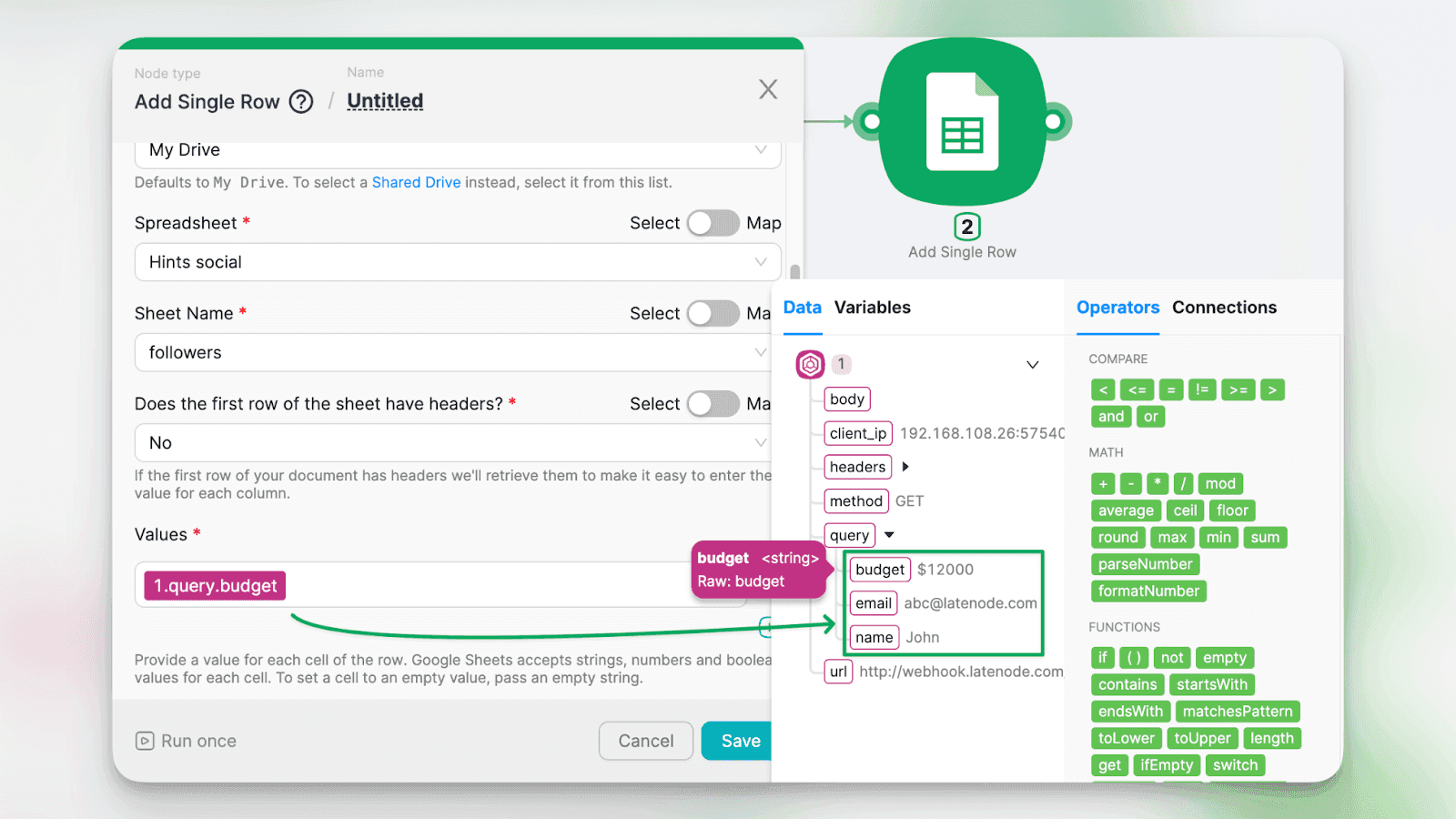 - Depois que os dados aparecerem no seu cenário, você poderá manipulá-los facilmente em qualquer módulo subsequente. A janela pop-up de Dados aparecerá sempre que você clicar em um campo onde os dados são obrigatórios ou permitidos, como o Valor que deve ser adicionado à sua Planilha Google como uma nova linha: