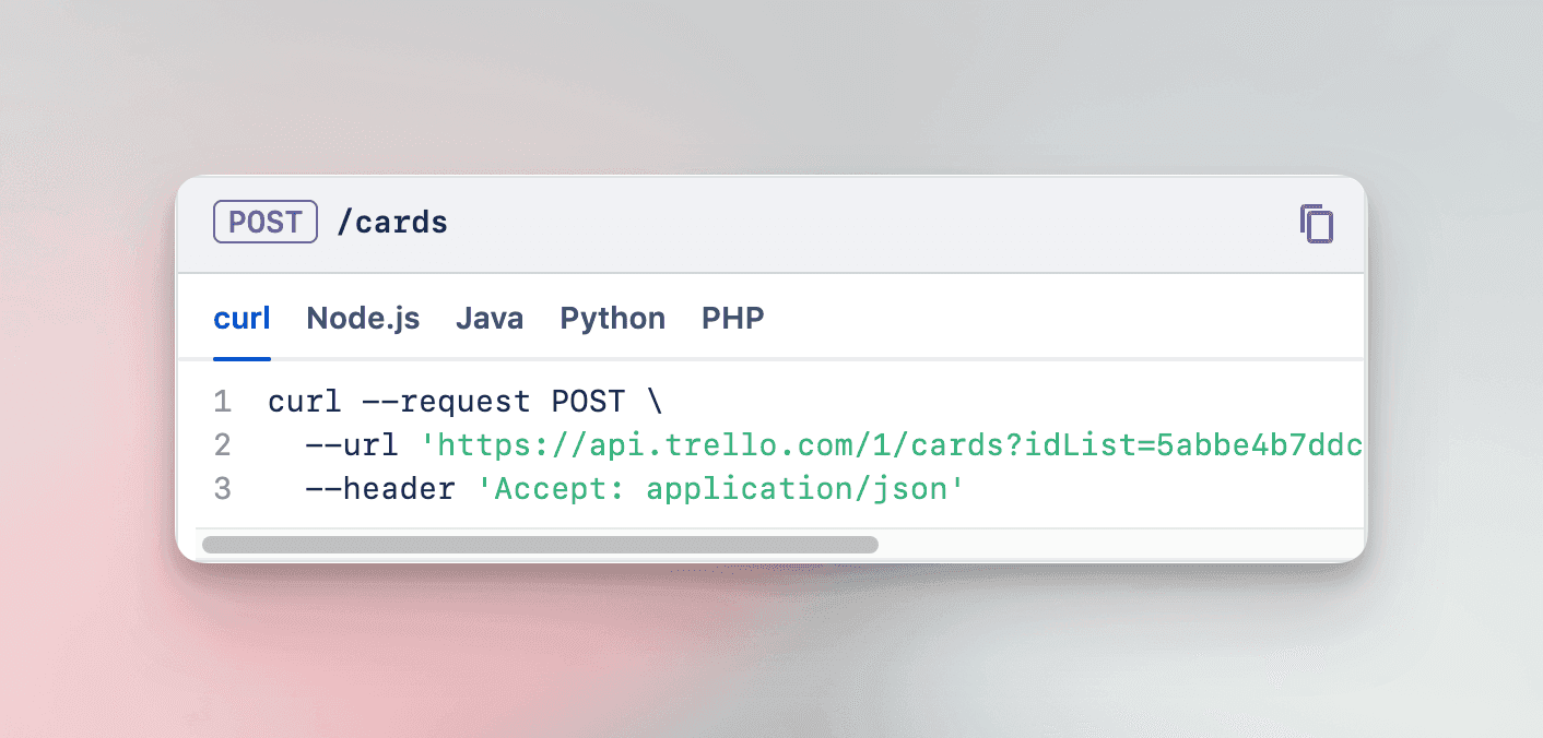 - Visite a documentação da API do Trello e localize um exemplo de cURL para a ação que você deseja executar dentro do seu cenário Latenode. Pense no exemplo de cURL como uma receita ou modelo pronto que instrui o Latenode sobre como se comunicar com esse outro aplicativo.