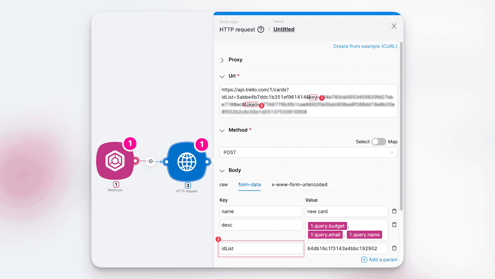 - Em seguida, substitua os placeholders para a API Key e Access Token pelos seus atuais. Além disso, adicione os parâmetros necessários para a execução da ação. No nosso caso, para adicionar um novo cartão, precisamos especificar ao Trello onde ele deve ser colocado, então precisamos do ID da coluna do nosso workspace – idList.